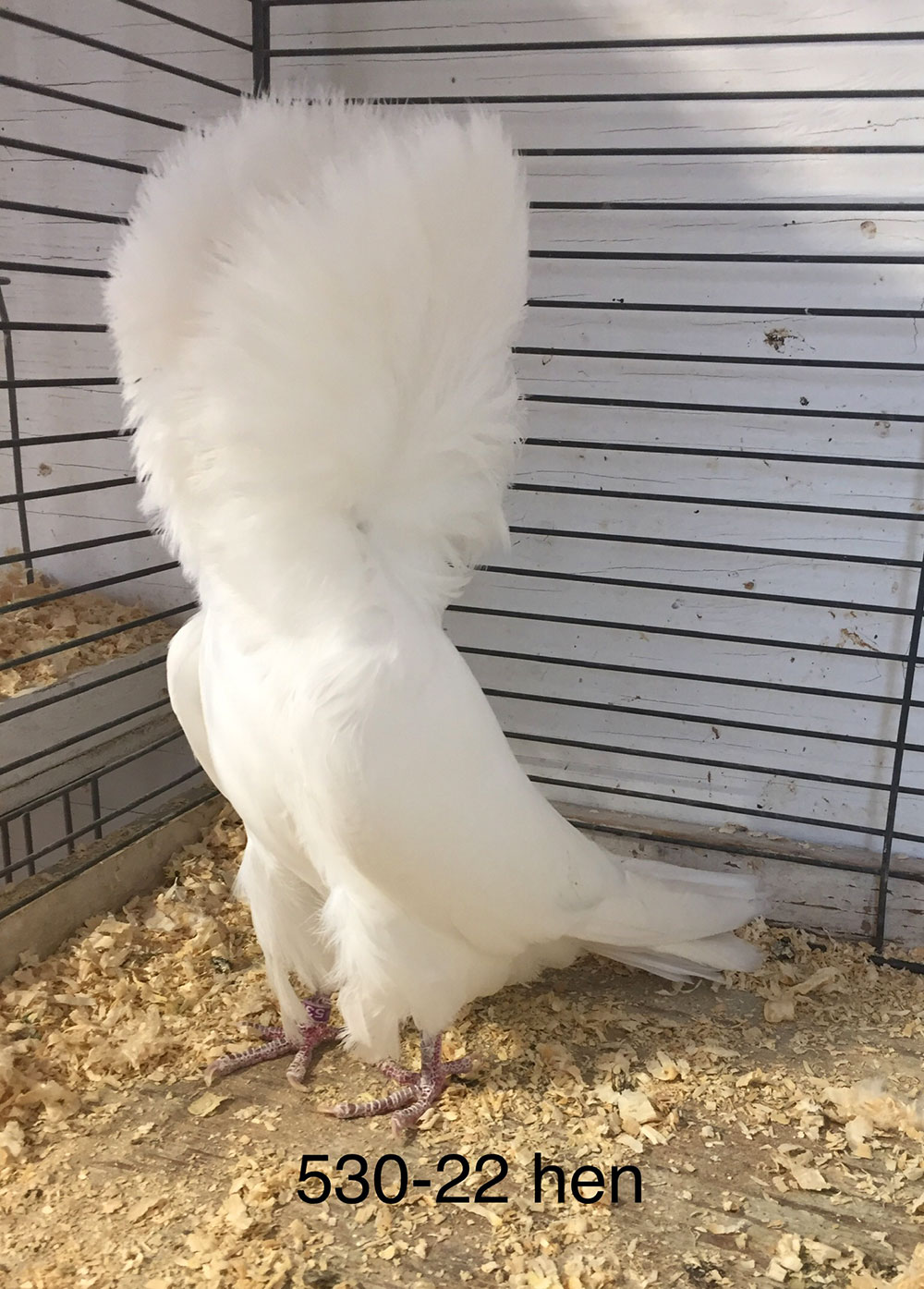 Perfect leg placement, wonderful chain, nice rose, loads of top. The kind of hen I look for to keep things moving forward in my program. You will have a very hard time finding a white hen of this quality for sale anywhere. She breeds very well and has given me some very exciting young whites to work with. I had her mated to a couple different cocks with great results. |