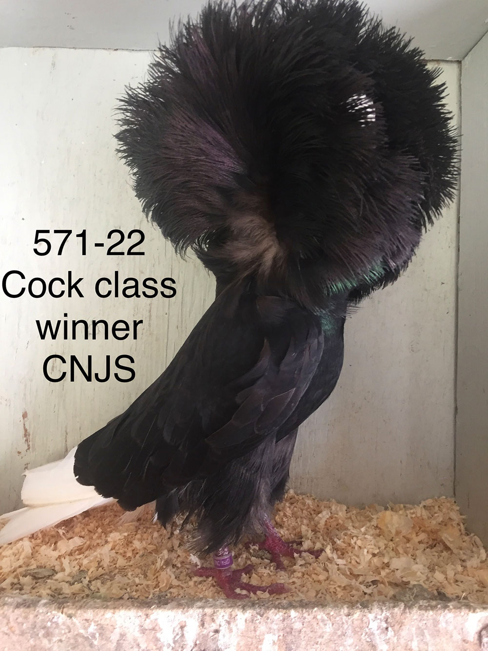 He is tall and slender with hard feather and a nice rose. He is very good. He was mated to the lot 25 Black hen with no band for most of the season. |